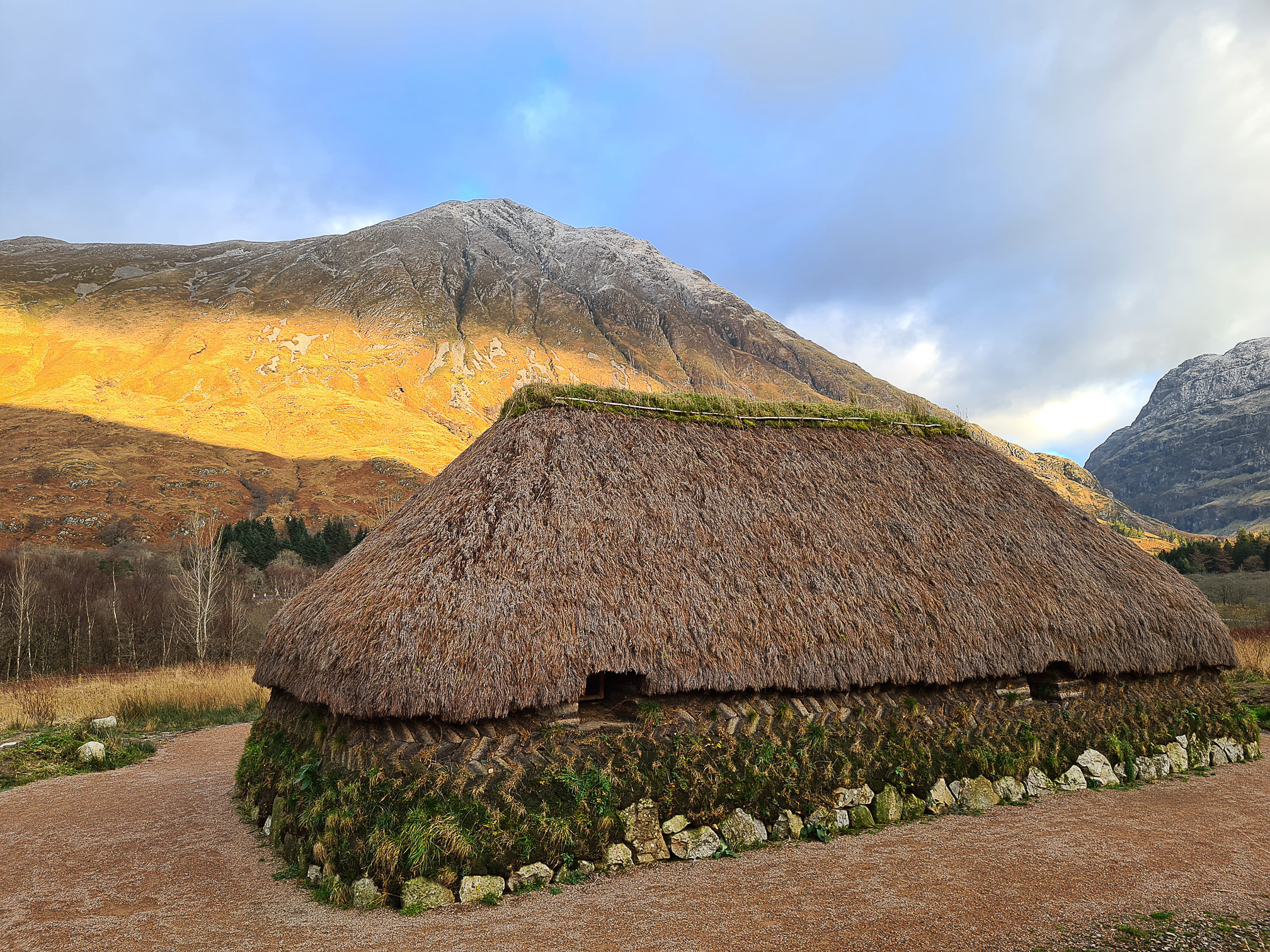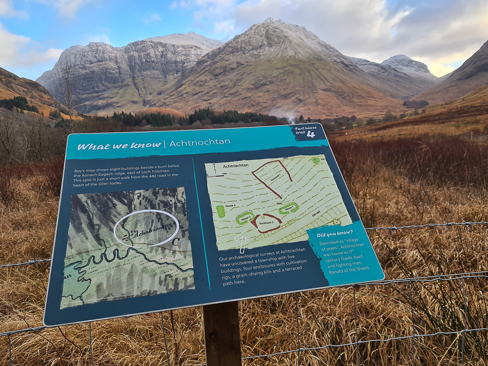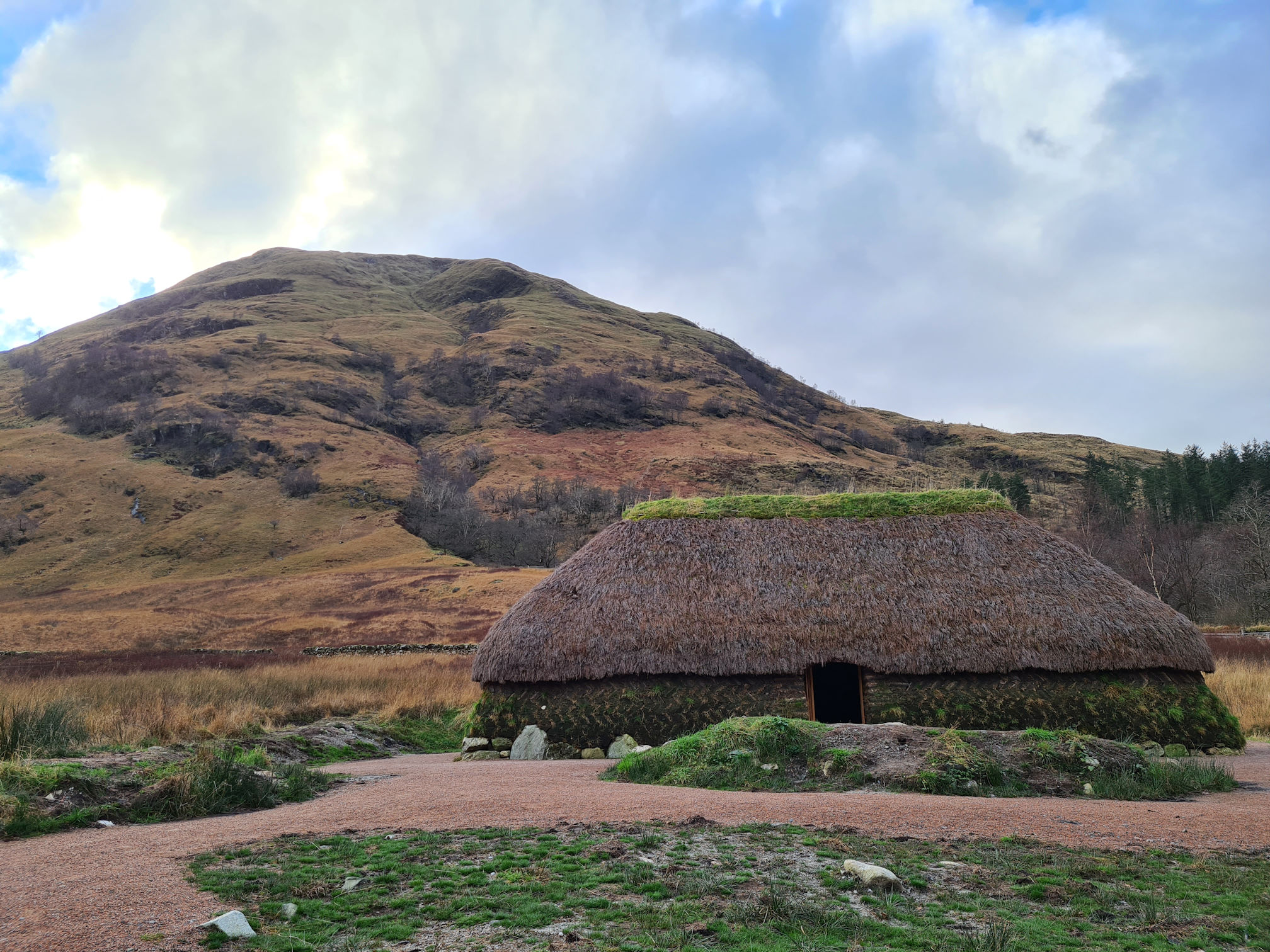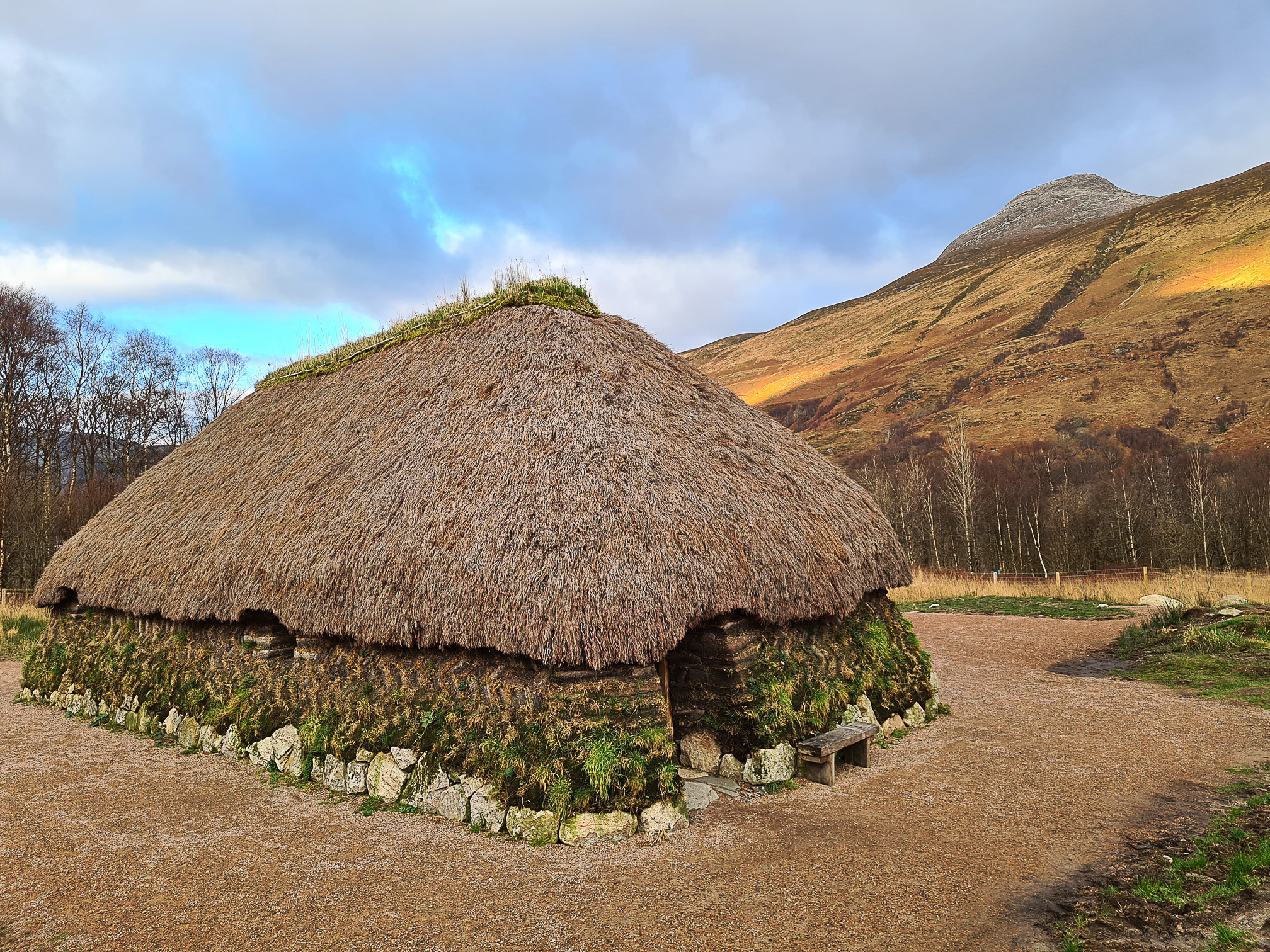 The turf house reconstruction was inspired by archaeological excavations at place called Achtriochtan. General Roy’s military survey map, between 1747-55, shows clusters of buildings or townships in the glen, including at Achtriochtan.