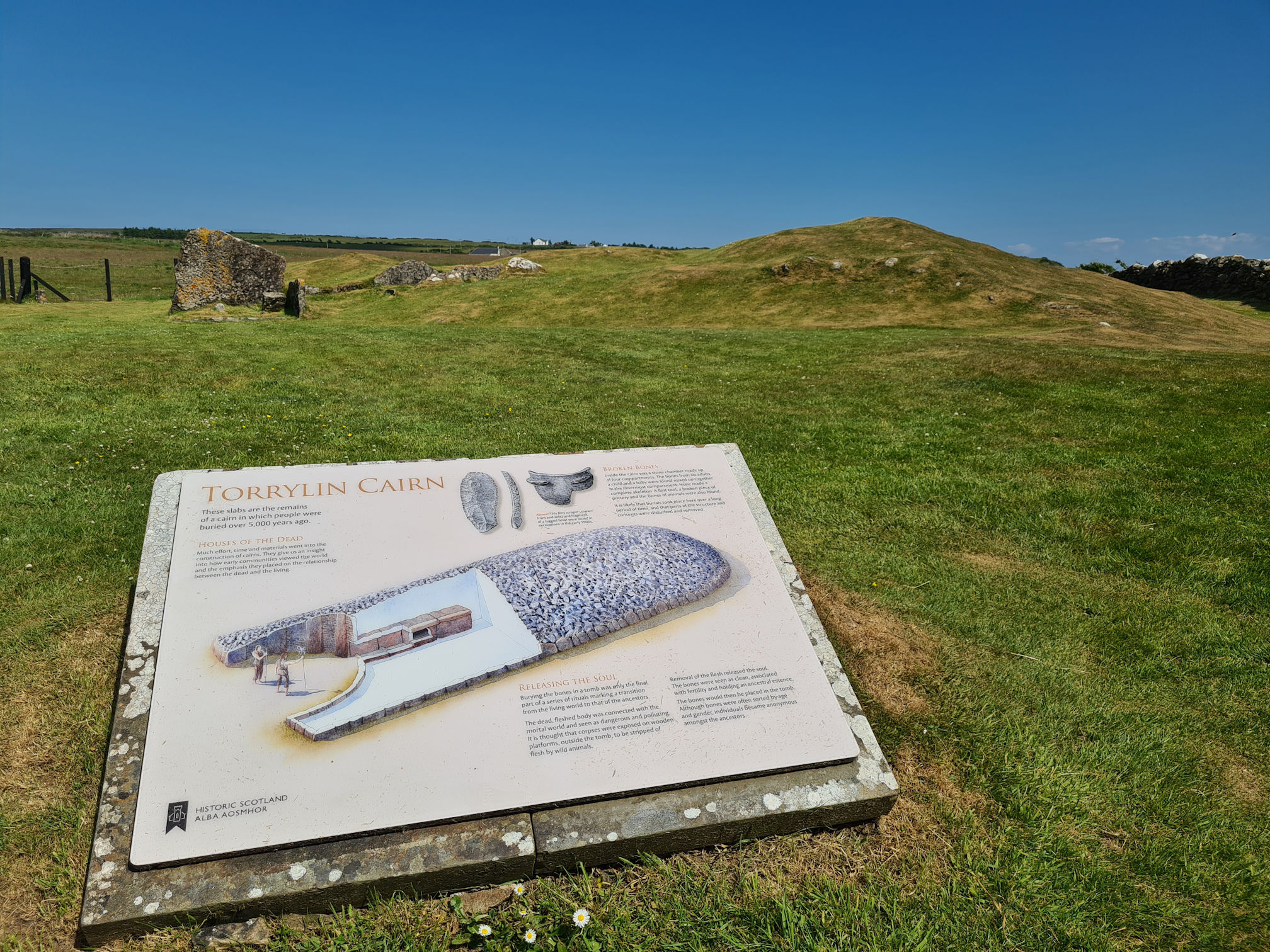 The stone chamber that was inside the cairn had four compartments, one of which bones from six adults, a child and a baby were found. Over 5,000 years ago the chambered cairn would have looked like below.